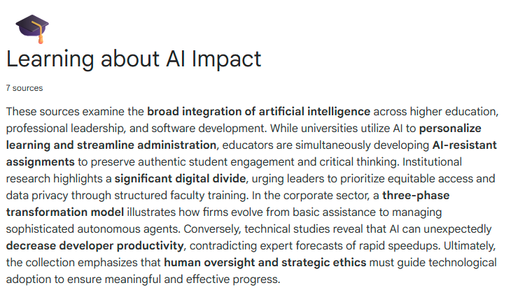On a daily basis, I devote 15-20 minutes to reviewing a wide range of higher education articles, research, and opinion pieces. Generally, this information is delivered to my inbox from various Higher Ed expert organizations (OLC, The Chronicle, Inside Higher Ed, CCDaily, etc.). However, when I wanted to take a deeper dive into AI literature and research, the scope of materials was overwhelming. I needed to get an overview understanding of several AI developing concepts, but I couldn’t devote hours of time to this task. Upon recommendation from a colleague, I explored NotebookLM and I’m currently using the free version of this tool. This tool fits my needs because it limits responses to prompt to ONLY the sources I input into the “notebook” – this can be files, websites, videos, copied text or Google Drive items. I really like how this provides a “picket fence” around the material I’m using and, in turn, the results I would get. I also like that this tool does not share out your prompts. So I think of this as an AI Assistant which sorts the information I locate (and now the latest version includes an embedded search box for faster locating) and provides me with an overview as either an audio file, a video or an infographic. I appreciate having all these options, but currently my main use is for aggregating research findings and opinions about the overall impact of AI on education, especially higher education. I still read the articles, but having Notebook “bundle” the data for me and suggest big summary ideas is very helpful for me. I did have a separate use case where I created a separate NotebookLM to create a video but I wasn’t happy with the results because it sounded too stilted and the visuals were not engaging.